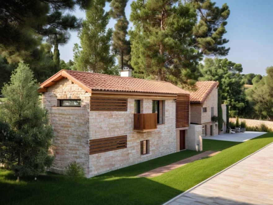 Двуетажна къща с гараж и еднопространствена дневна на две нива с кухненски бокс и трапезария на първия етаж и три спални на втория. Екстериора на къщата е решен само с естествени материали – камък и дърво, с модерен прочит на провансалските китни къщи във Франция.